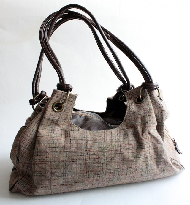 Pojemna torba o ciekawym fasonie. Torba posiada podszewkę, a w niej dwie małe kieszonki. Główna przegroda jest zapinana na suwak, natomiast przegrody bodczne zapinane są na zatrzaski. Torba została wykonana z tkaniny oraz skóry ekologicznej lub naturalnej. Stan torby bardzo dobry (nie ma widocznych wad).
