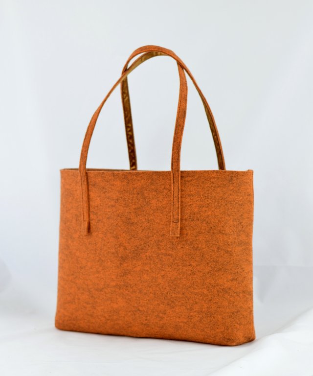 Torebka została wykonana z grubego i mocnego filcu. Prosta, minimalistyczna forma. Rączki torebki zostały wzmocnione poprzez podszycie ich taśmą satynową. Torebka wygląda naprawdę ładnie! Szerokość torebki 45cm, wysokość bez rączki - około 32 cm, głebokość - 8cm, długość rączki od brzegu do brzegu torebki- 60cm. Została wykonana z dbałością o każdy szczegół. W środku znajdują się 2 filcowe kieszonki. Jedna na telefon, a druga jest zamykana na suwak. Torebka nie posiada zamknięcia.