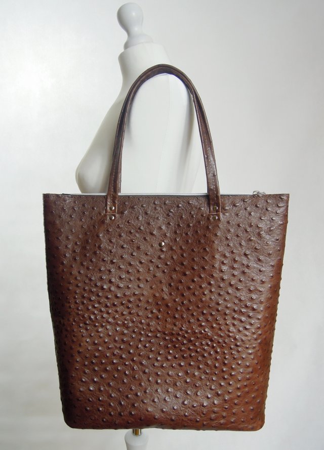 Torebka została wykonana z brązowej, naturalnej skóry bydlęcej. Wzór tłoczony - struś. Prosta, minimalistyczna forma. Torebka jest starannie wykonana, wygląda naprawdę ładnie! Maksymalna szerokość torebki - 41 cm, wysokość - 37 cm, głębokość - około 12 cm. Dno torebki jest zabezpieczone 4 nóżkami w kolorze srebrnym. Została wykonana z dbałością o każdy szczegół - zapięcie na suwak. W środku znajduje się ładna podszewka z kieszonkami na telefon oraz dużą kieszonką zapinaną na suwak. Torebka jest pojemna - mieści format A4 pionowo i poziomo. Gorąco polecam!