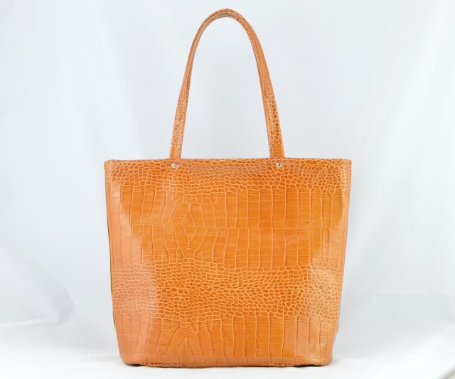 Torebka została wykonana z grubej skóry naturalnej bydlęcej w kolorze rudym. Skóra została przetłoczona we wzór imitujący skórę krokodyla. Prosta, minimalistyczna forma. Torebka jest starannie wykonana, wygląda naprawdę ładnie! Maksymalna szerokość torebki - 41 cm, szerokość na dole - 32, wysokość - 34 cm. Dno torebki jest usztywnione i zabezpieczone przez zniszczeniem przymocowanymi 4 nóżkami. Została wykonana z dbałością o każdy szczegół - zapięcie na suwak. W środku znajduje się ładna podszewka z kieszonkami na telefon oraz dużą kieszonką zapinaną na suwak. Torebka jest pojemna - mieści format A4.