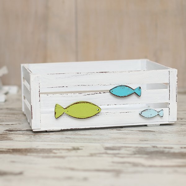 Drewniana skrzynka z listew drewnianych, malowana ręcznie metoda shabby chic, widoczne przetarcia nadają jej niepowtarzalny charakter. Sprawdza się jako dekoracja na półce, stole, nadaje się np. na skrzynkę, w której podamy owoce.