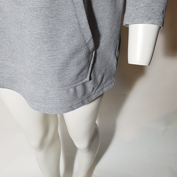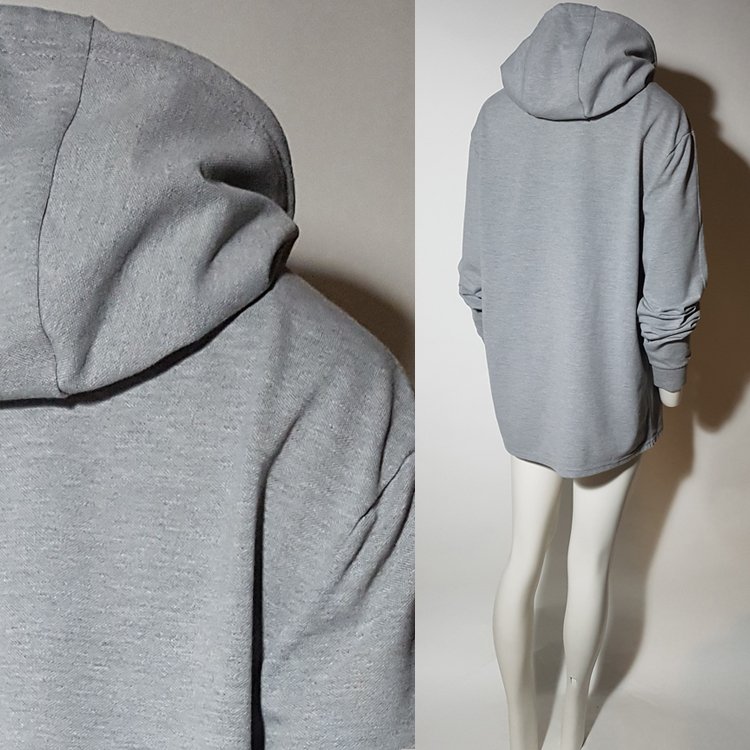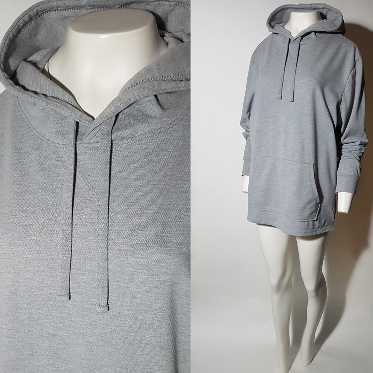 Szara bluza z kapturem. Z przodu kieszeń typu kangur, rękawy długie zakończone ściągaczem. Wykonana z dzianiny typu tenis. Szerokość ramion sugeruje, że jest to bluza męska, przy czym z oversizowymi ramionami będzie dobra również na większe rozmiary damskie.