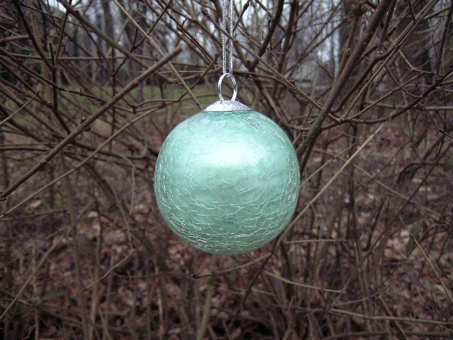 Duża Szklana ciekawie wykonana KULA - ZAWIESZKA.. Bombką choinkową być może,ale dekoracja niezaprzeczalną z każdej właściwie okazji i bez również. Szkło barwione od wewnątrz,ale jednak światło nieco przepuszczające. Powierzchnia gladka, lśniąca,ale w głębi cala kraklami pokryta. Kraklowania w świetle nieco świecą., niby srebrne babiego lata niteczki.Ciekawa bardzo.