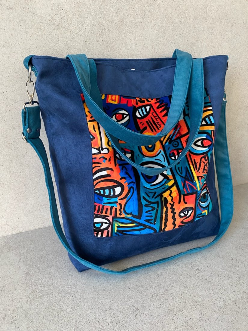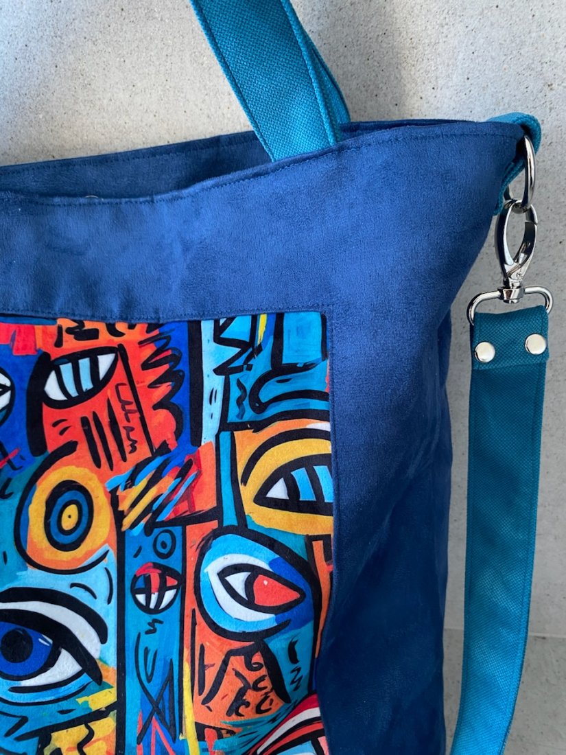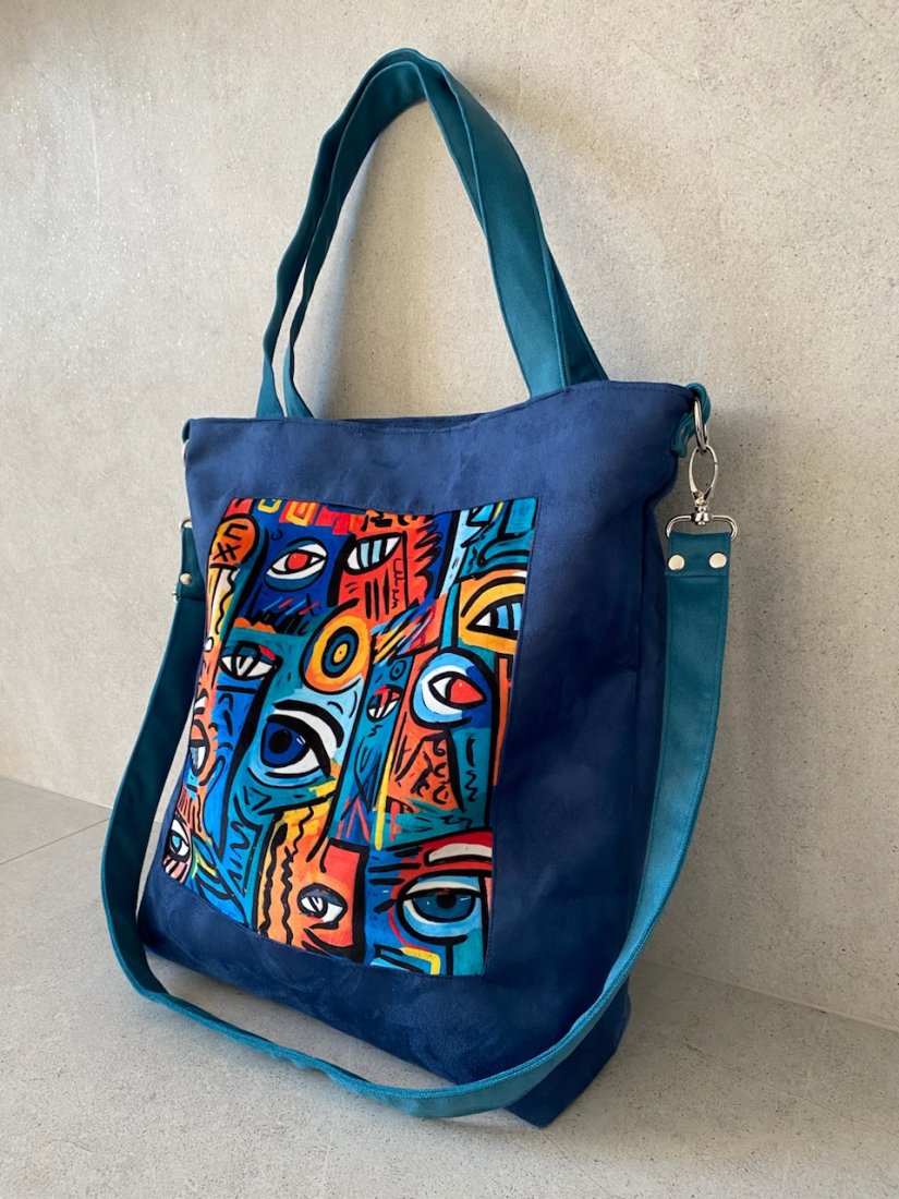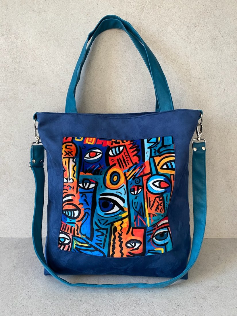 Przepastna torba wykonana z zamszu syntetycznego z welurowym printem.