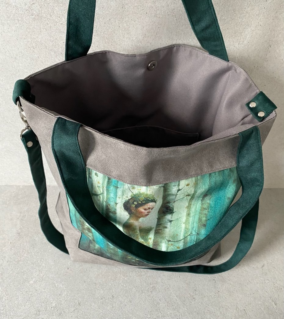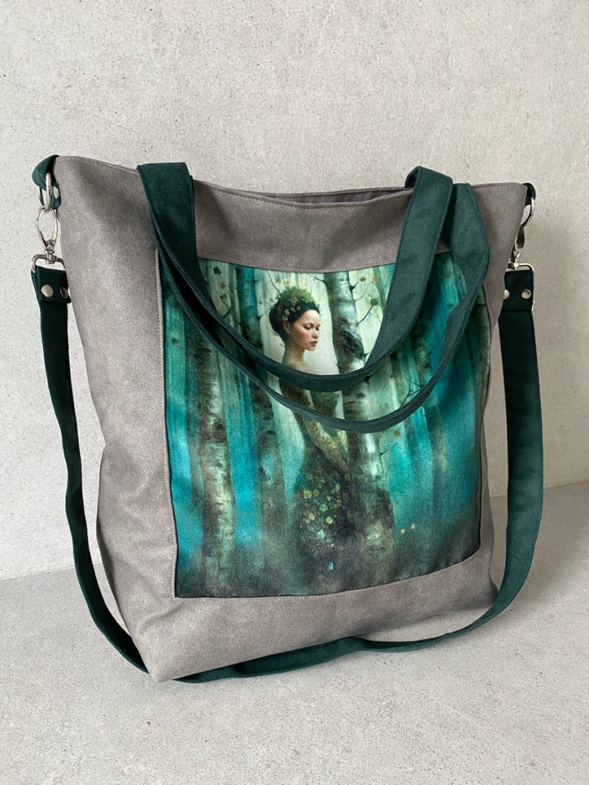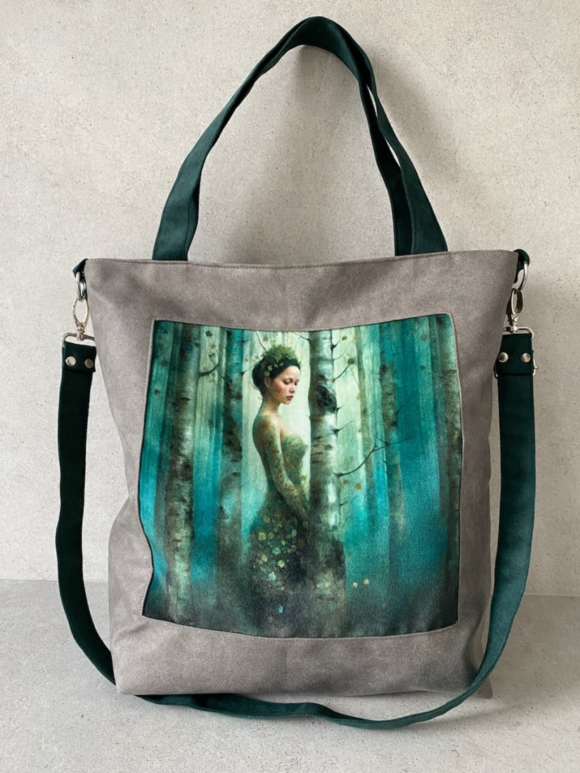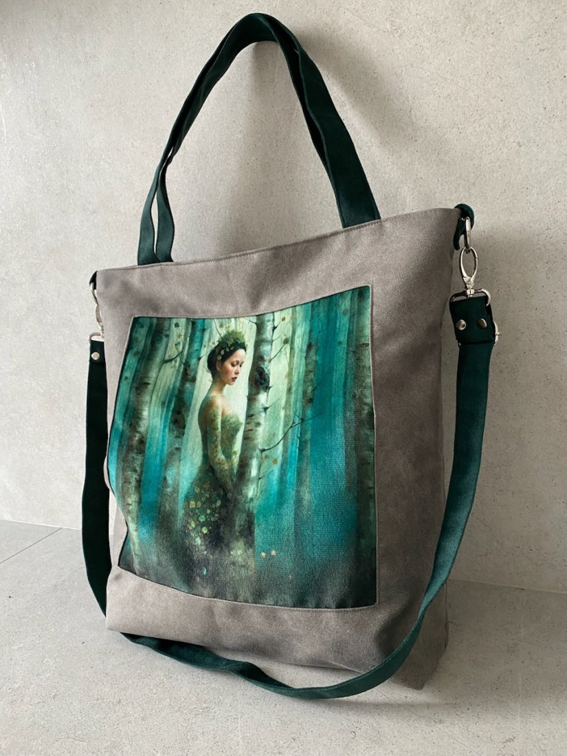 Przepastna torba z serii "Duchy lasu" wykonana z nubuku syntetycznego z welurowym printem.