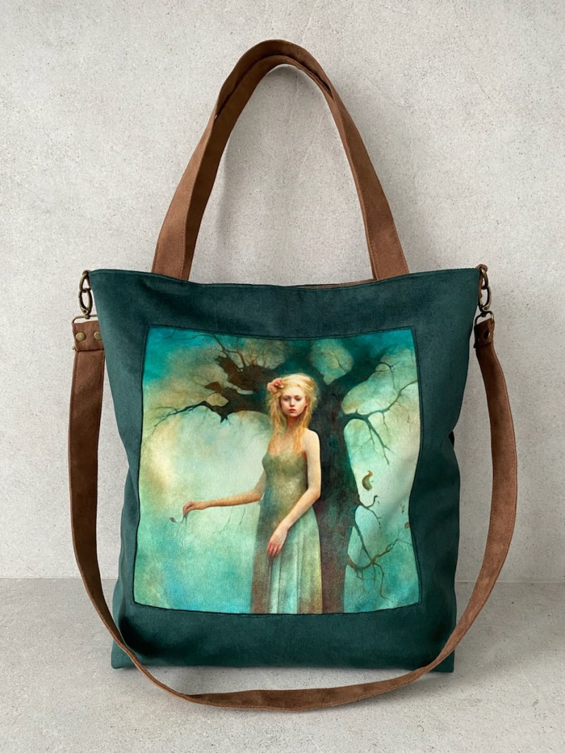 Przepastna torba z serii "Duchy lasu" wykonana z tkaniny welurowej z printem.