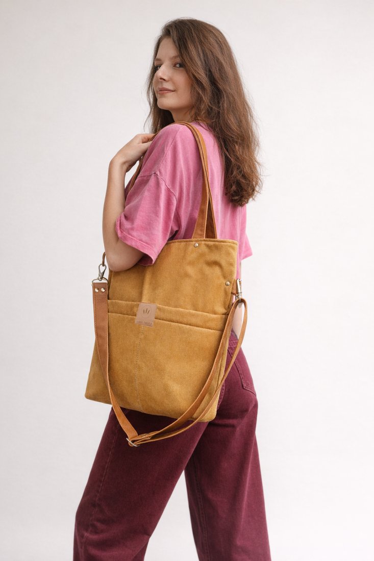 Prostokątna torebka z kieszeniami na froncie z miodowego, gładkiego nubuku.