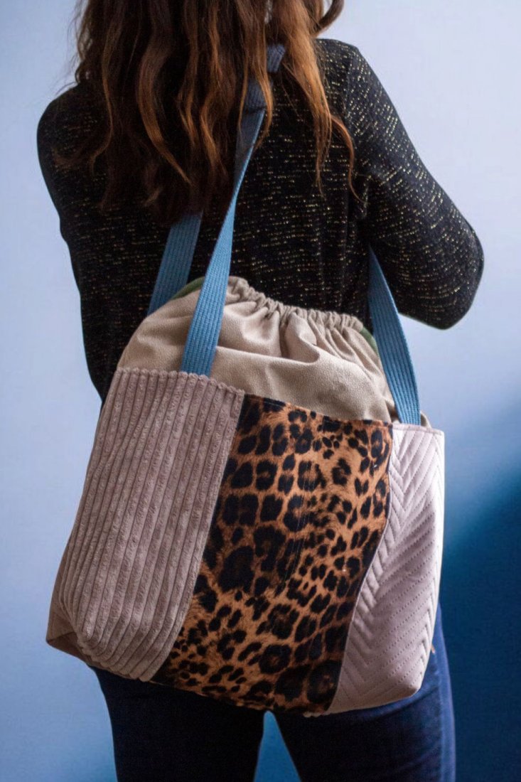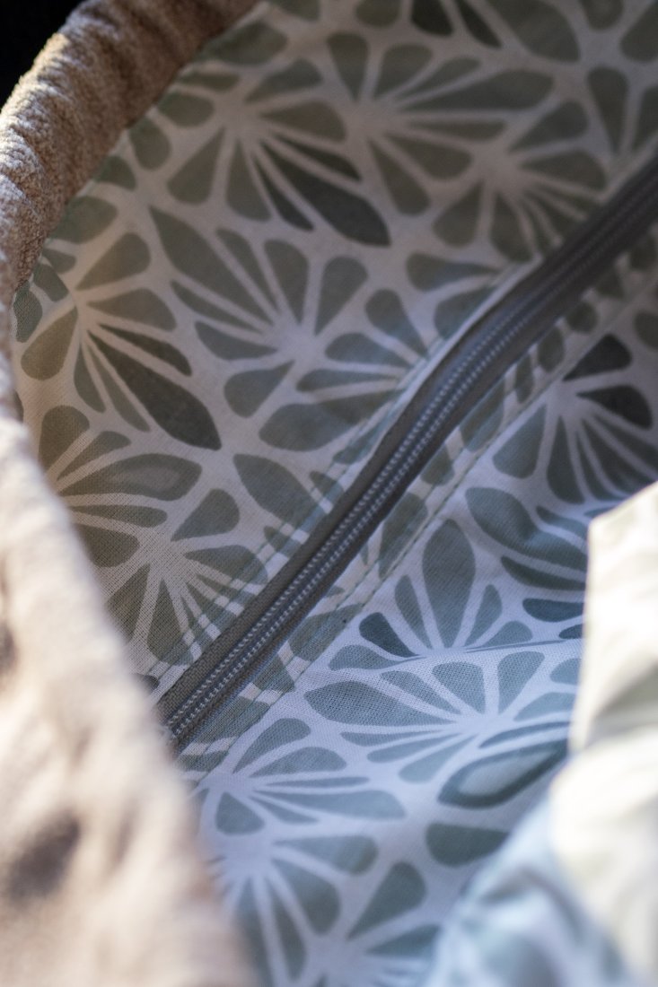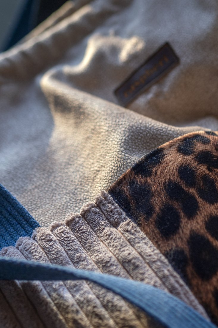 Wykonana z beżowego weluru, z przodu dwie kieszenie z weluru oraz sztruksu. Bawełniane pasy w kolorze jeansowym i wzorzysta, bawełniana podszewka.