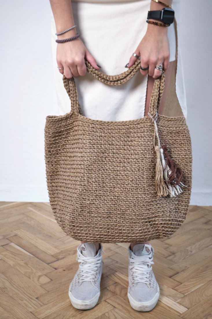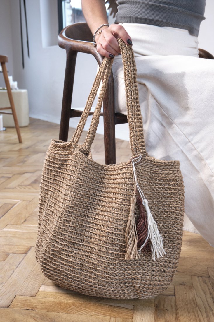 Ręcznie robiona torebka szydełkowa wykonana z naturalnego jutowego sznurka.