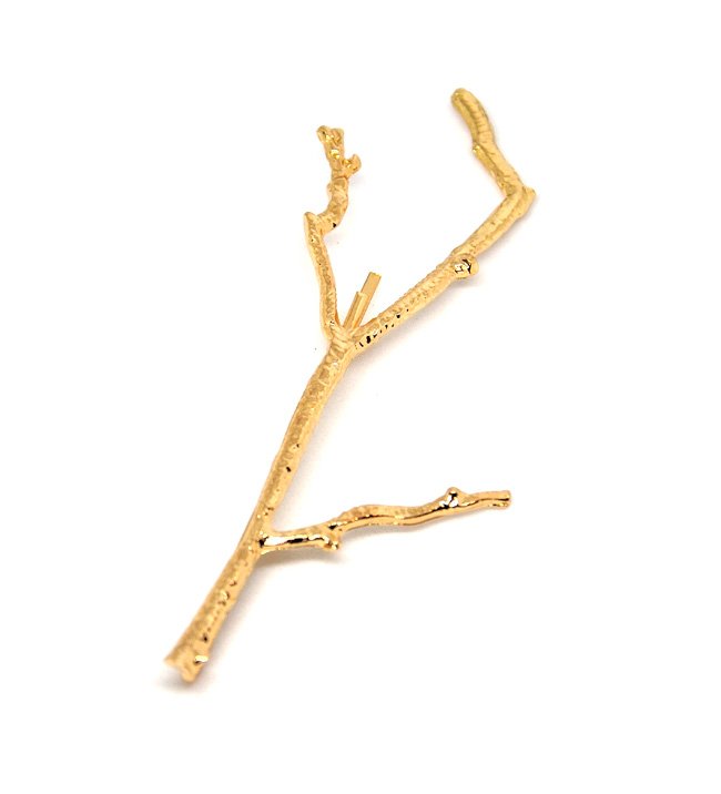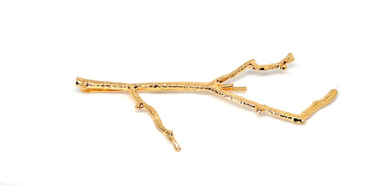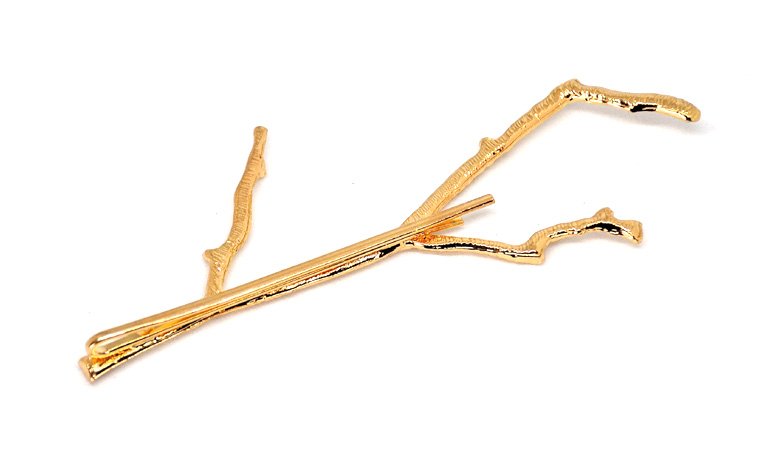 Wykonana z metalu w kolorze mocno połyskującego złota duża ozdobna wsuwka w kształcie gałęzi drzewa.