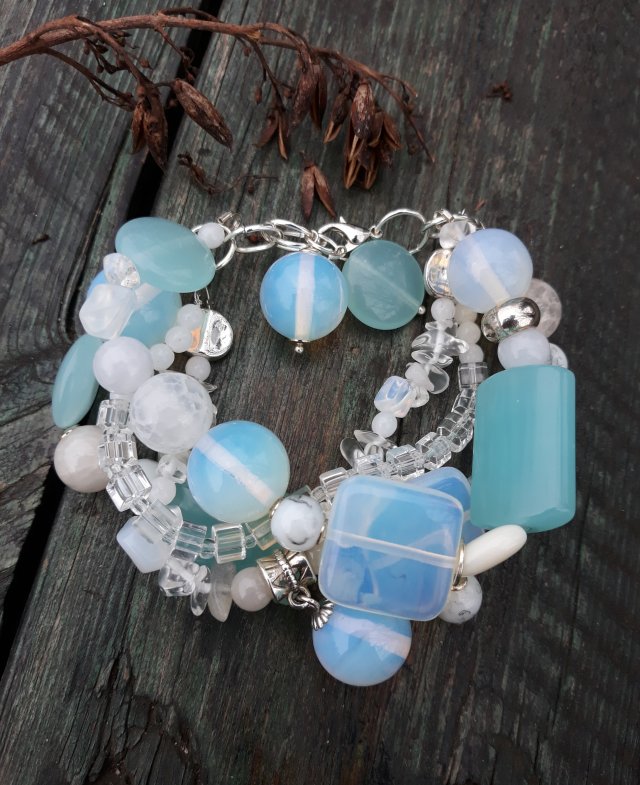 Piękna bransoletka w bieli i błękicie wykonana z opali, białego agatu spękanego, błękitnego kwarcu i szklanych koralików w odcieniach bieli i szarości. Bransoletkę można nosić samą lub w komplecie z kolczykami.