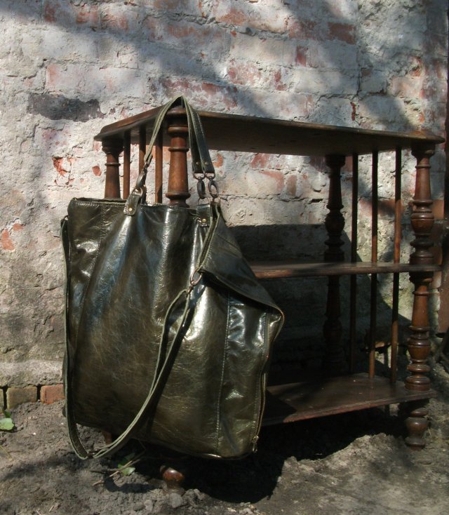 Duża skórzana torba uszyta z miękkiej zielonej skóry z metalicznym połyskiem, lekko złotawa w słońcu.
