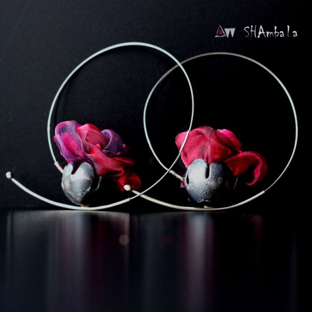 Niezwykłe, ekscentryczne kolczyki z serii PĄCZKI duże, koła. Awangardowe i oryginalne, przepięknie prezentują się na uchu. Ich nietypowa forma zestawiona jest z wielowarstwową organtyną w kolorach karminu, bordo i oberżyny. Kolczyki wykonane są z oksydowanego srebra. Obręcz zamyka się w wymiarach 6 na 7 cm. Średnica srebrnego pączka to 2,2 cm. Gorąco polecam:)