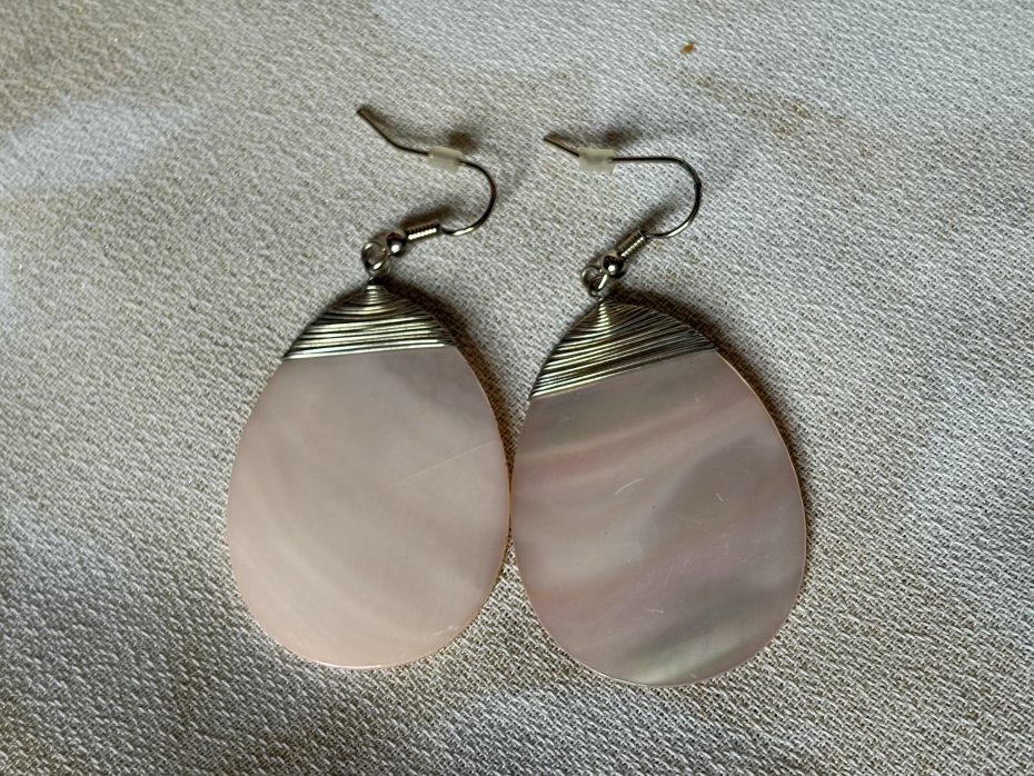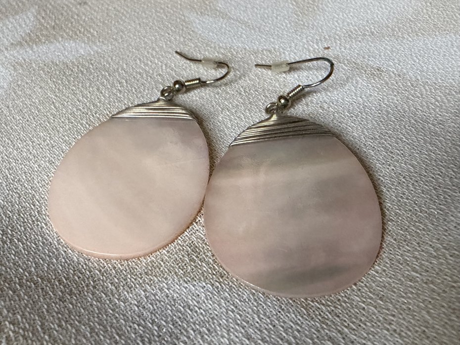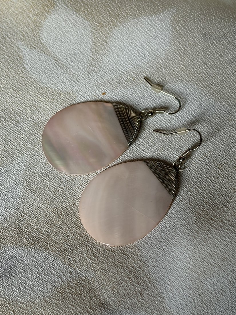 Duże , efektowne kolczyki z subtelnie różową masą perłowa . Nowe nie używane . Szerokość 3 cm wysokość calkowita 6 cm wysokość zawieszki 4,5 cm . Stan zachowania bardzo dobry. Uwaga !!! Nie czyszczę srebra i platerów specjalnie do sprzedaży .