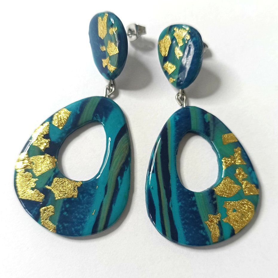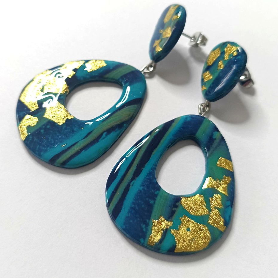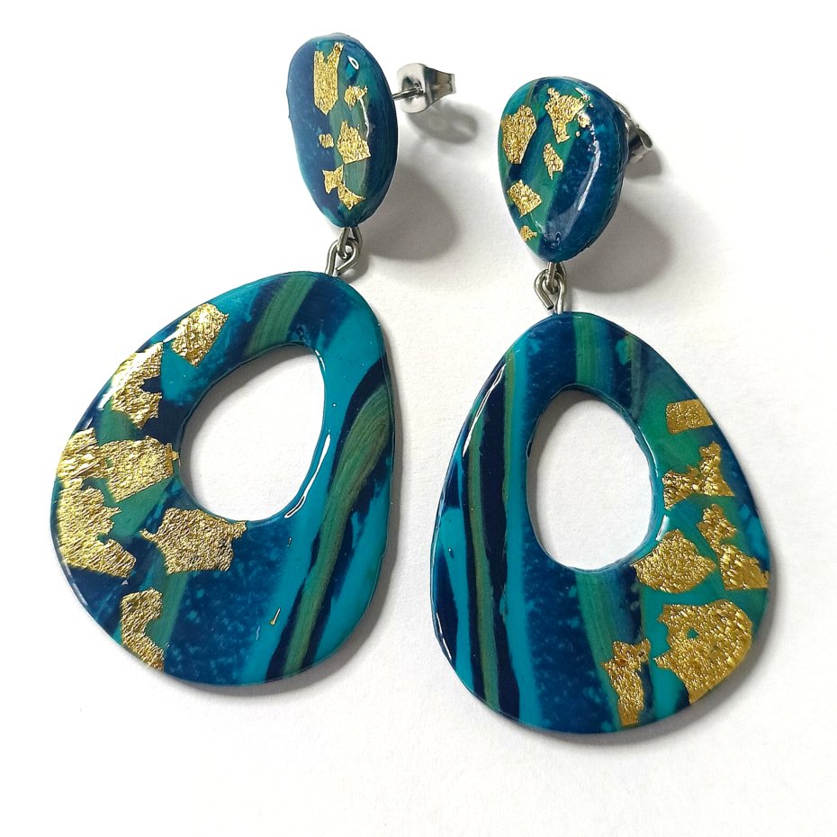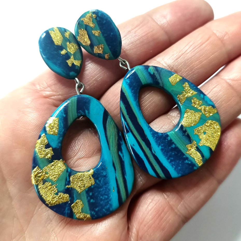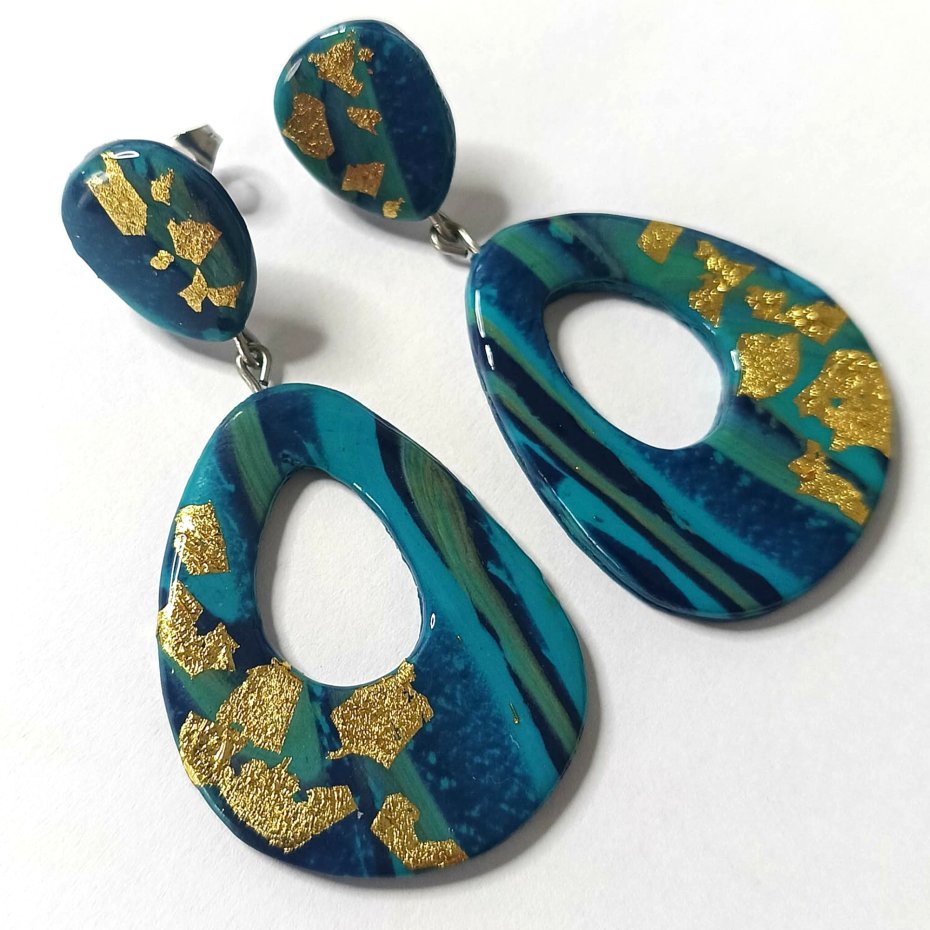 Te odważne i artystyczne kolczyki są ręcznie wykonane z glinki polimerowej w kolorach turkusowo niebieskim, złotym i czarnym. Ich unikalny design tworzy nowoczesny, abstrakcyjny wygląd, dzięki czemu stanowią prawdziwy element przyciągający uwagę.