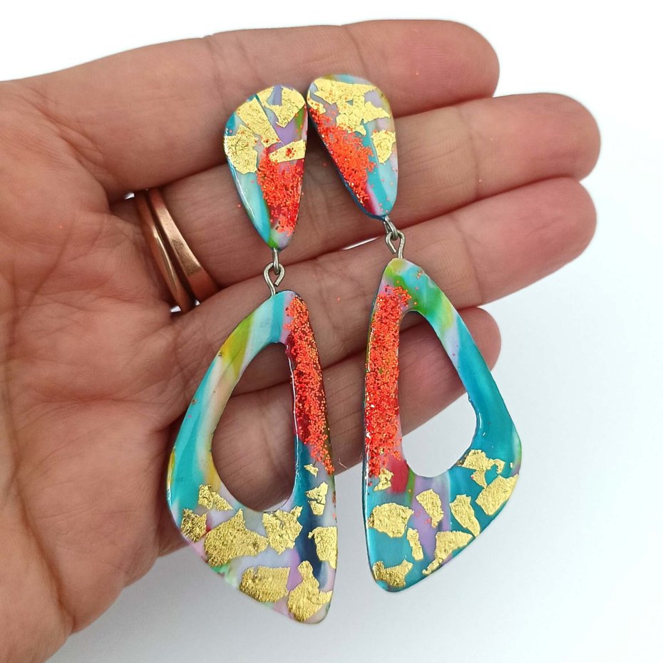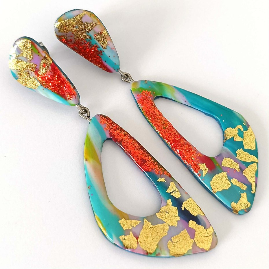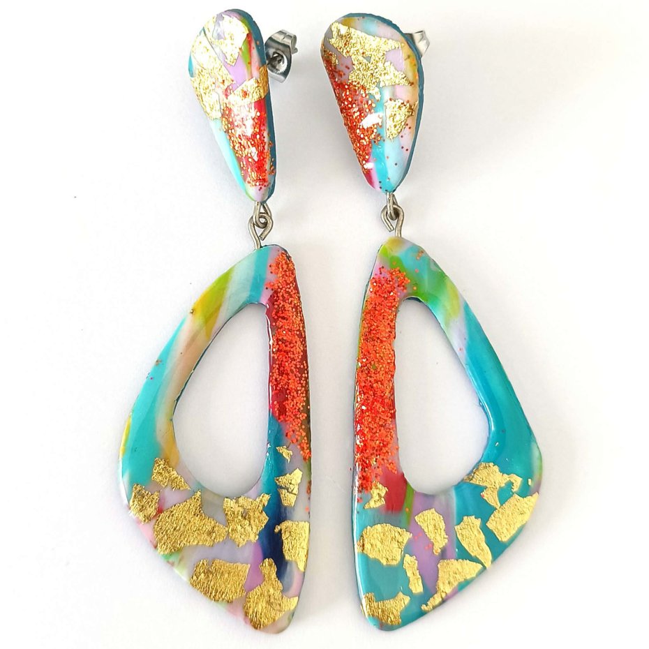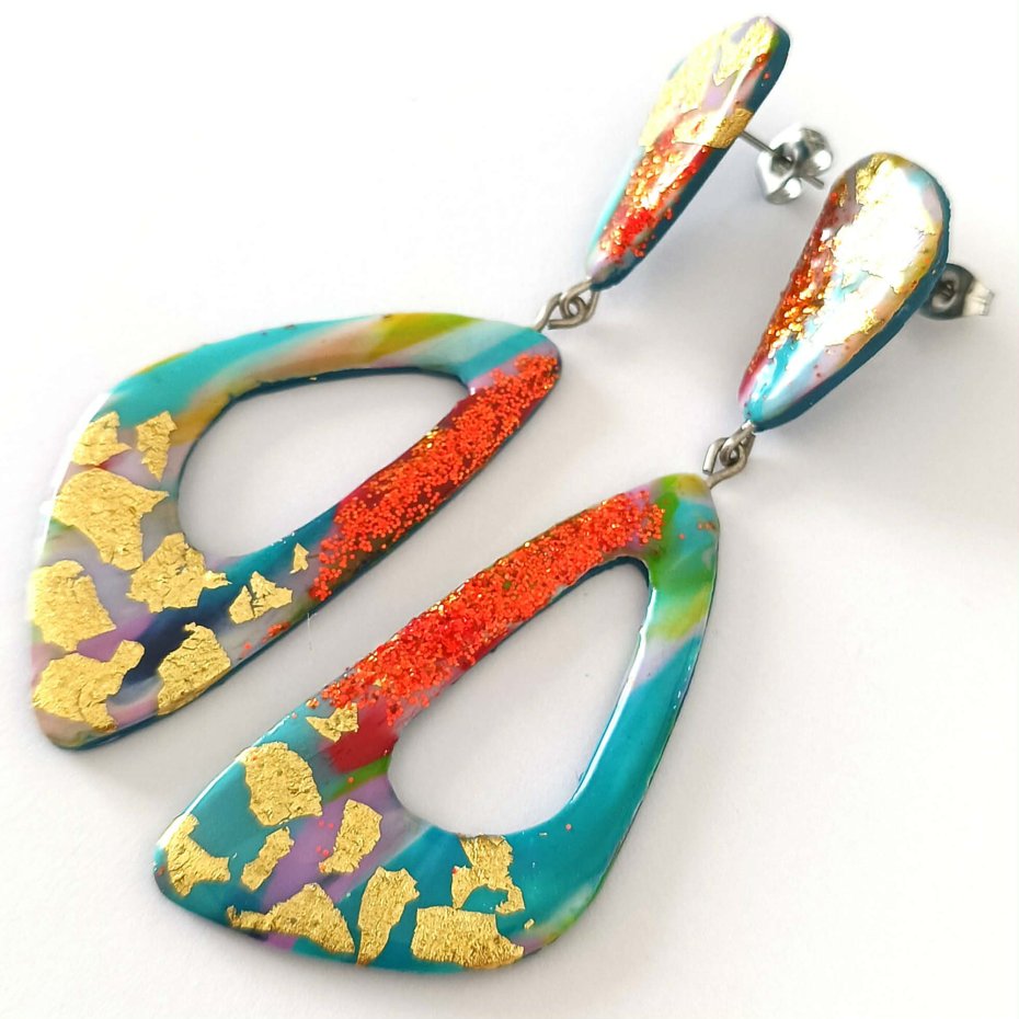 Kolczyki zachwycają intensywnymi kolorami, brokatowym wykończeniem i nowoczesnym, geometrycznym kształtem. To idealny dodatek dla miłośniczek odważnej, oryginalnej biżuterii.