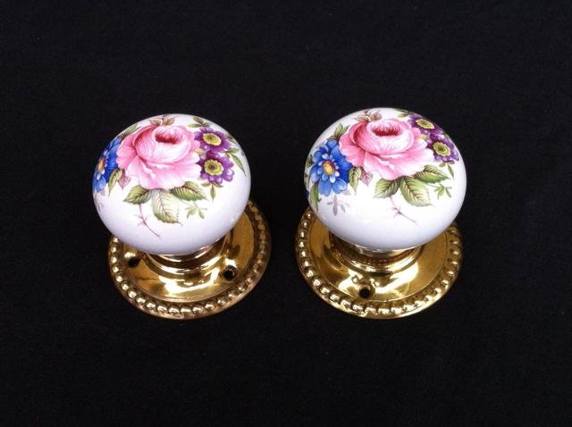 Wielce efektowne, eleganckie i stylowe duże drzwiowe gałki - mosiężne zdobione kołnierzyki i pełna, biała porcelana z bukietowym zdobieniem. Mocowanie na trzy śrubki; przygotowane do bolca kwadratowego 7-8 mm. Satynowo-błyszczące szkliwienie. Prawdziwy skarb, prawdziwa ozdoba. Kołnierze 6,6; gałki 5,7; wysokość 6,5 cm. Stan zachowania ogólny i porcelany bardzo dobry, mosiądz z charakterystycznymi niuansami głębi, do ewentualnego doczyszczenia. Wartościowa rzadkość :)