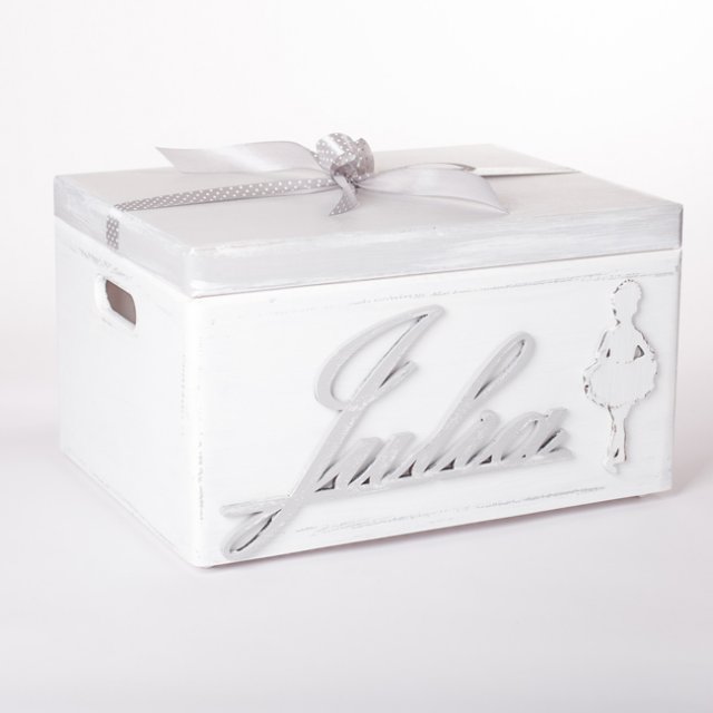Kapitalne pudło dla tych, którzy mają wiele skarbów do ukrycia. Całość ozdobiona elegancką baletnicą, Rozweseli wnętrze i pomoże w utrzymaniu ładu. Gorąco polecam dla dużych i małych. W naszej pracowni kupić można również z tym motywem inne produkty. Wymiar 40 x 30 x 23 cm