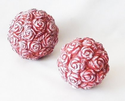 Dwie dekoracyjne kule w kolorze różanym. Kule są prawdopodobnie gipsowe. Na powierzchni wyrzeźbine róże. Kule są jeszcze w oryginalnych opakowaniach.