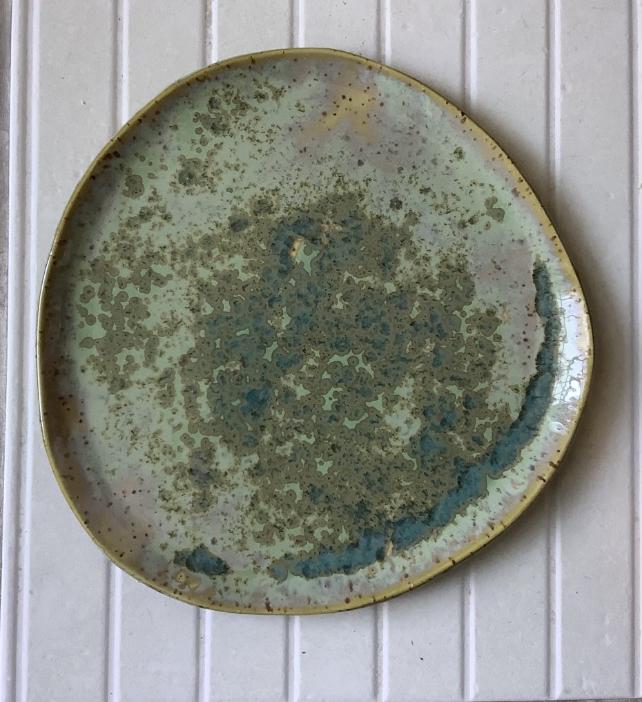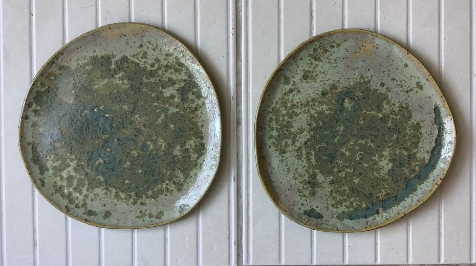 Zapraszam do kupna talerzy ręcznie robionych z jasnej kropkowanej gliny. Każdy wyjątkowy i jedyny w swoim rodzaju, chociaż szkliwione tym samym szkliwem - jasnym zielonym z ciemniejszymi zielonymi przebarwieniami . Niby obiadowe, ale świetnie sprawdzą się także, jako śniadaniowe - dla tych, którzy lubią mieć dużo miejsca na duże śniadanie:)