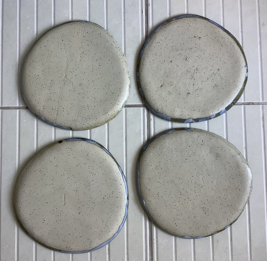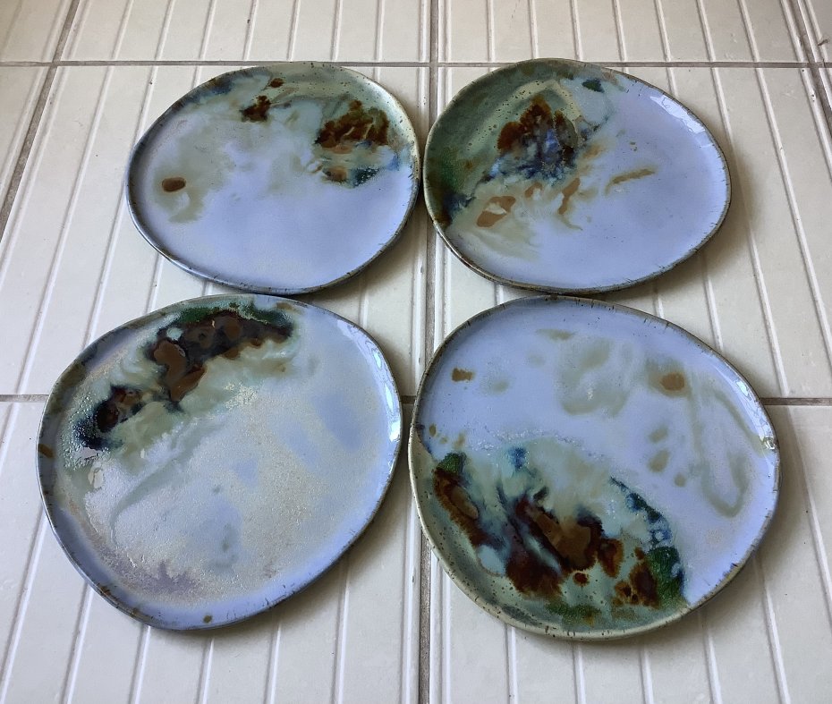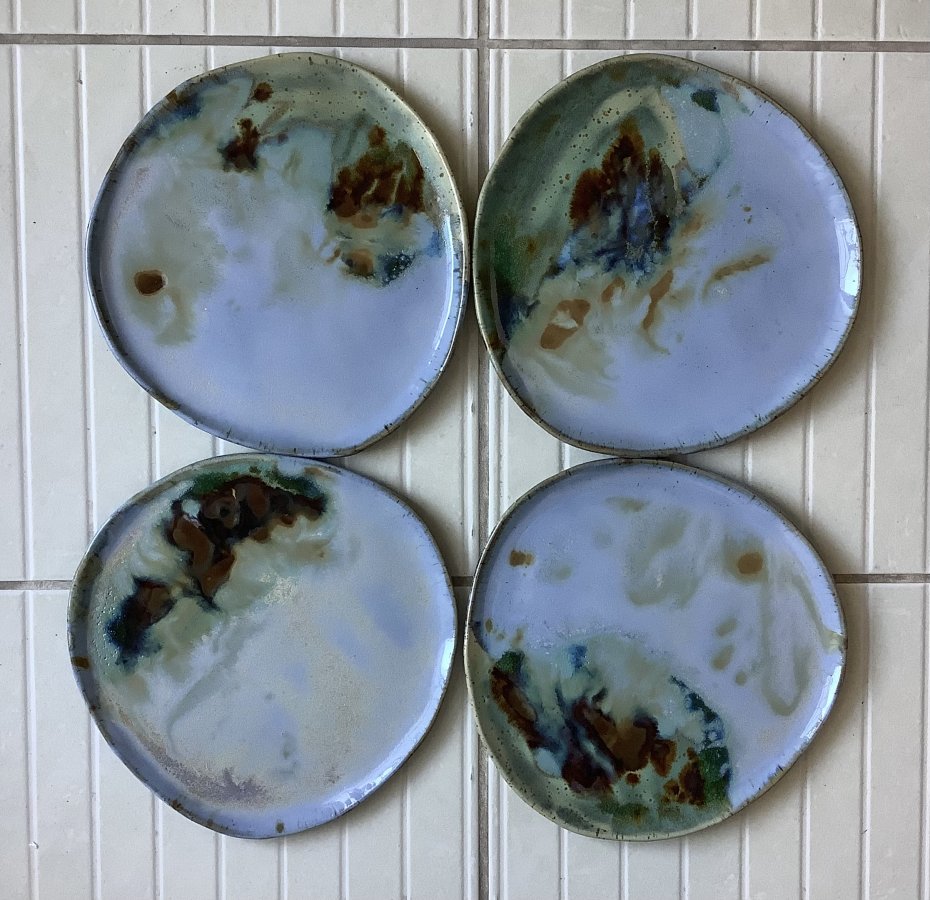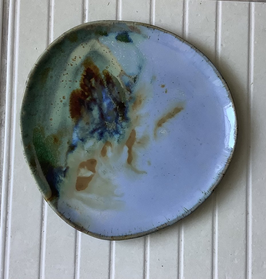Zapraszam do kupna talerzy ręcznie robionych z jasnej kropkowanej gliny. Każdy wyjątkowy i jedyny w swoim rodzaju, chociaż szkliwione tym samym szkliwem - jasnym błękitnym, brązem miodowym, trochę zieleni i turkusu. Niby obiadowe, ale świetnie sprawdzą się także, jako śniadaniowe - dla tych, którzy lubią mieć dużo miejsca na duże śniadanie:)