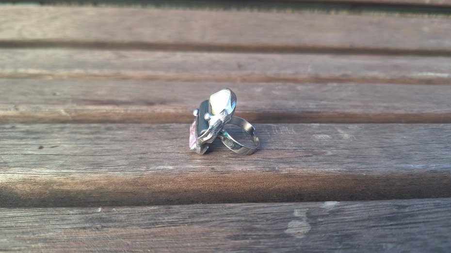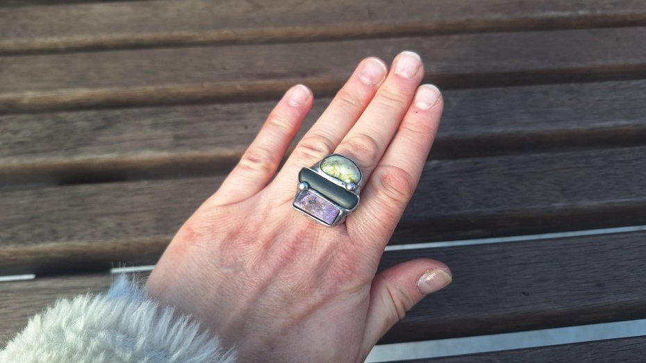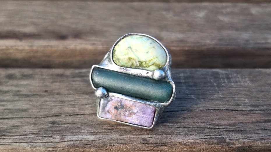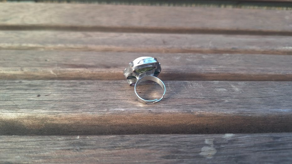 Pierścionek wykonany z miedzi, cyny, chryzoprazu, czaroitu i szkła. Wymiary ok. 2.5 na 2.5 cm. Regulowany. Nie jest ciężki.