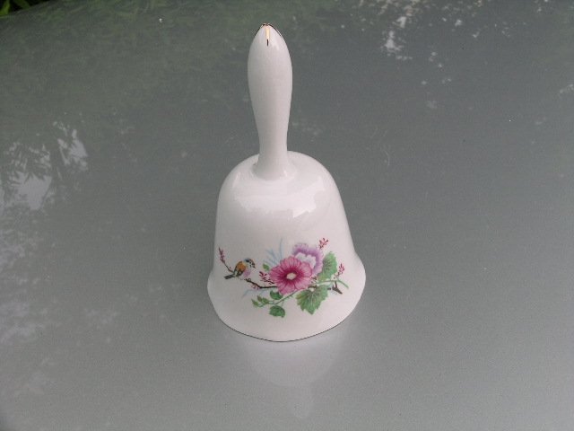 Duży Porcelanowy Dzownek. NIe sygnowany. Biała Porcleana,delikatny ptasio-kwiatowy wzór i szczypta złota. Miły,delikatny dzwięk. Na błyszcząco szkliwiony.