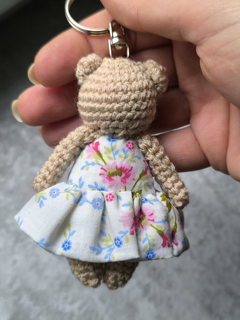 Misia została wykonana ręcznie na szydełku. Jej całkowita długość to 9 cm plus elementy metalowe 4 cm.
