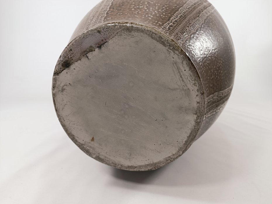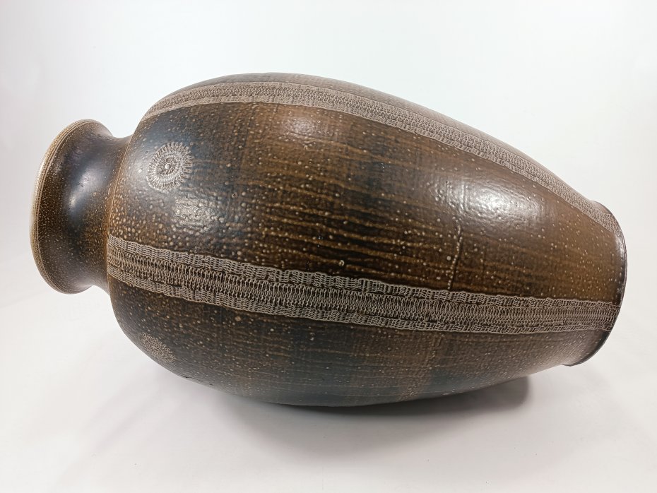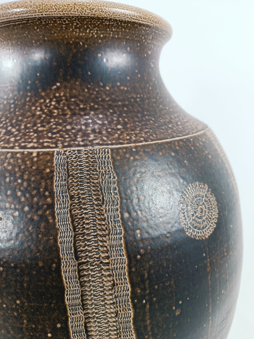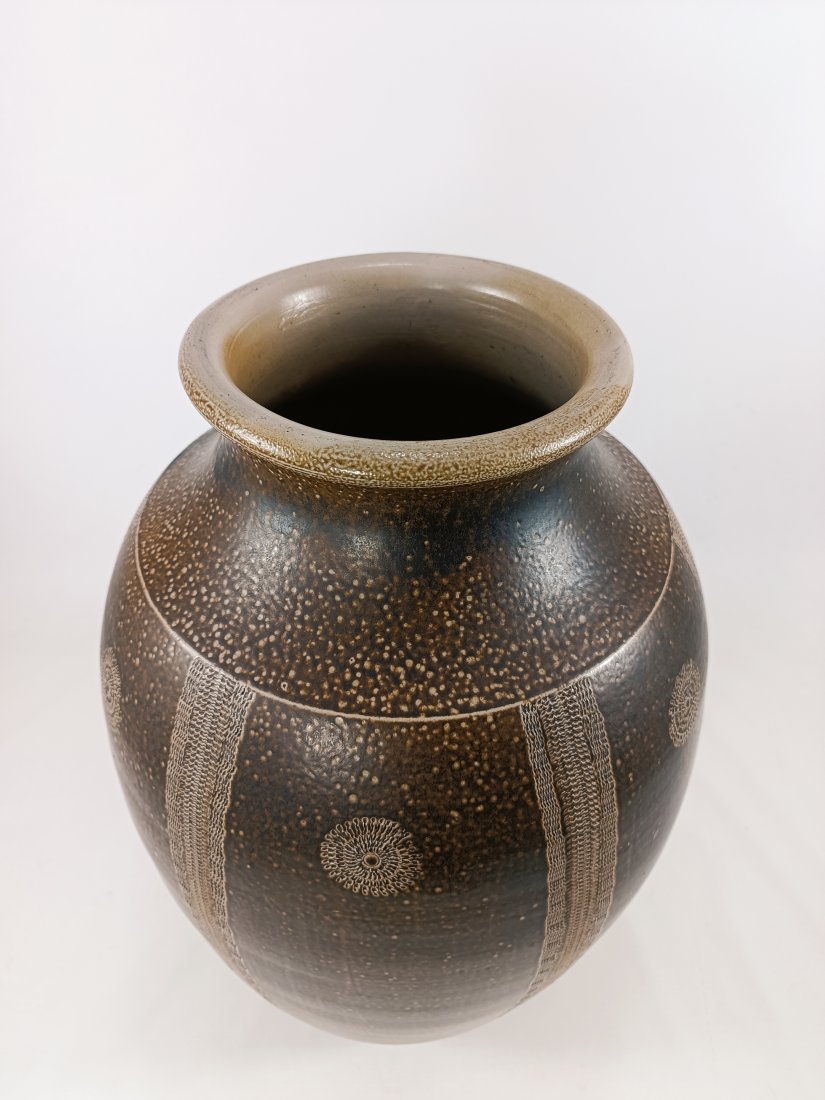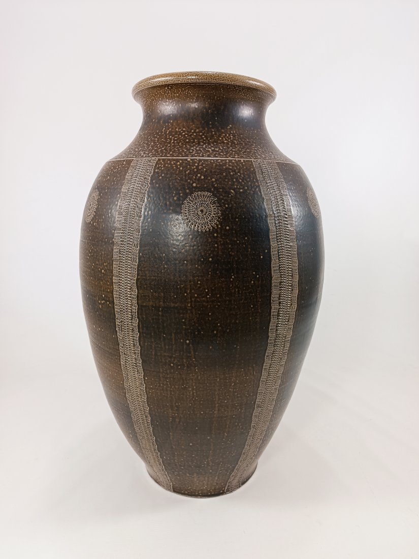 Duży, masywny wazon podłogowy wykonany z ceramiki. Ma ciemną, brązową barwę z jaśniejszymi, teksturowanymi zdobieniami wzdłuż boków oraz okrągłymi motywami przypominającymi rozety. Wazon ma klasyczny kształt zwężający się ku dołowi z pękatym korpusem. Stan zachowania bardzo dobry, bez uszkodzeń. Wysokość 65 cm.