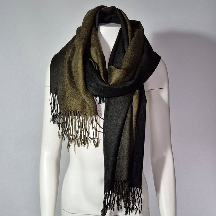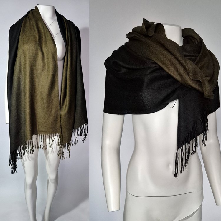 Elegancka, duża chusta/szal w odcieniach oliwkowej zieleni, brązu i czerni, tworzących efektowny ombre gradient. Wykonana z miękkiego, przyjemnego w dotyku materiału o delikatnym połysku – idealna na chłodniejsze dni oraz jako stylowe dopełnienie codziennych i wieczorowych stylizacji.