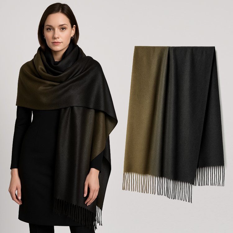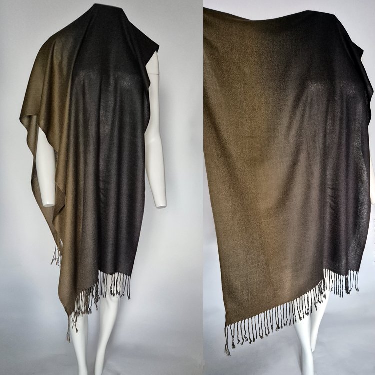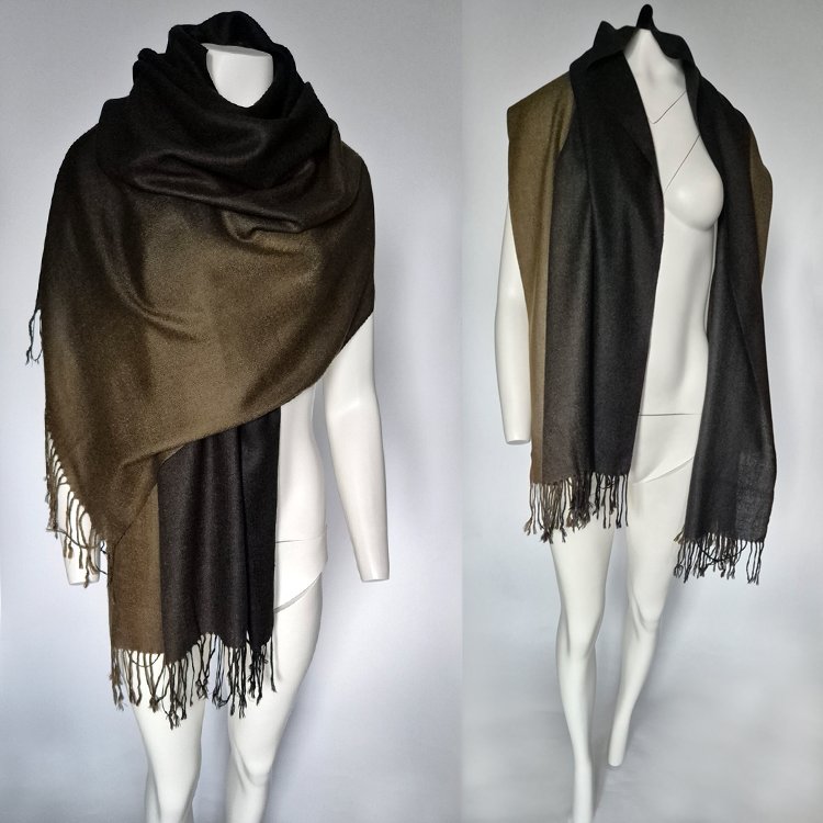 Elegancka, duża chusta/szal w odcieniach oliwkowej zieleni, brązu i czerni, tworzących efektowny ombre gradient. Wykonana z miękkiego, przyjemnego w dotyku materiału o delikatnym połysku – idealna na chłodniejsze dni oraz jako stylowe dopełnienie codziennych i wieczorowych stylizacji.