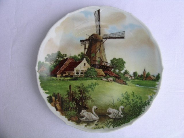 Duży dekoracyjny talerz porcelanowy, sygnowany Royal Schwabap Holland. Stylowa malatura w dawnym rustykalnym stylu - autentyczna holenderska sielanka :) Satynowy. Brzeg ryflowany. Z tyłu profesjonalny spręźynowy uchwyt do zawieszenia. 24 x 3 cm. Stan zachowania bardzo dobry. Doskonały na prezent dla kolekcjonera.