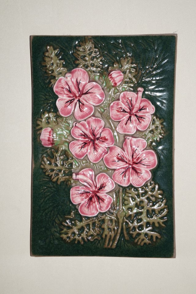 tło w kolorze butelkowej zieleni, kwiaty w kolorze pudrowego różu, szkliwiony na błyszcząco, gotowy do powieszenia
