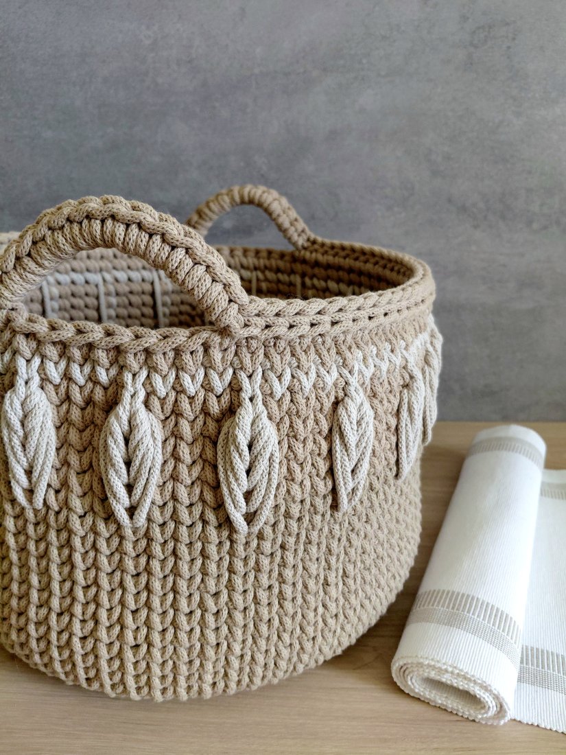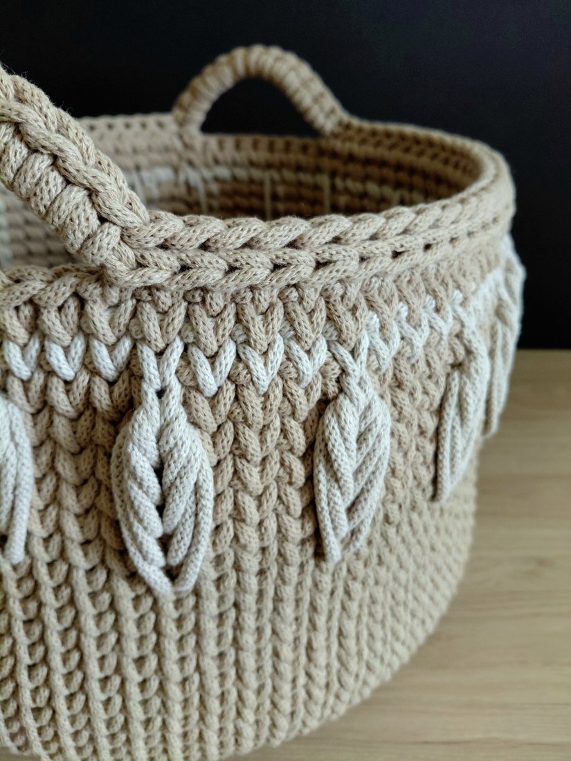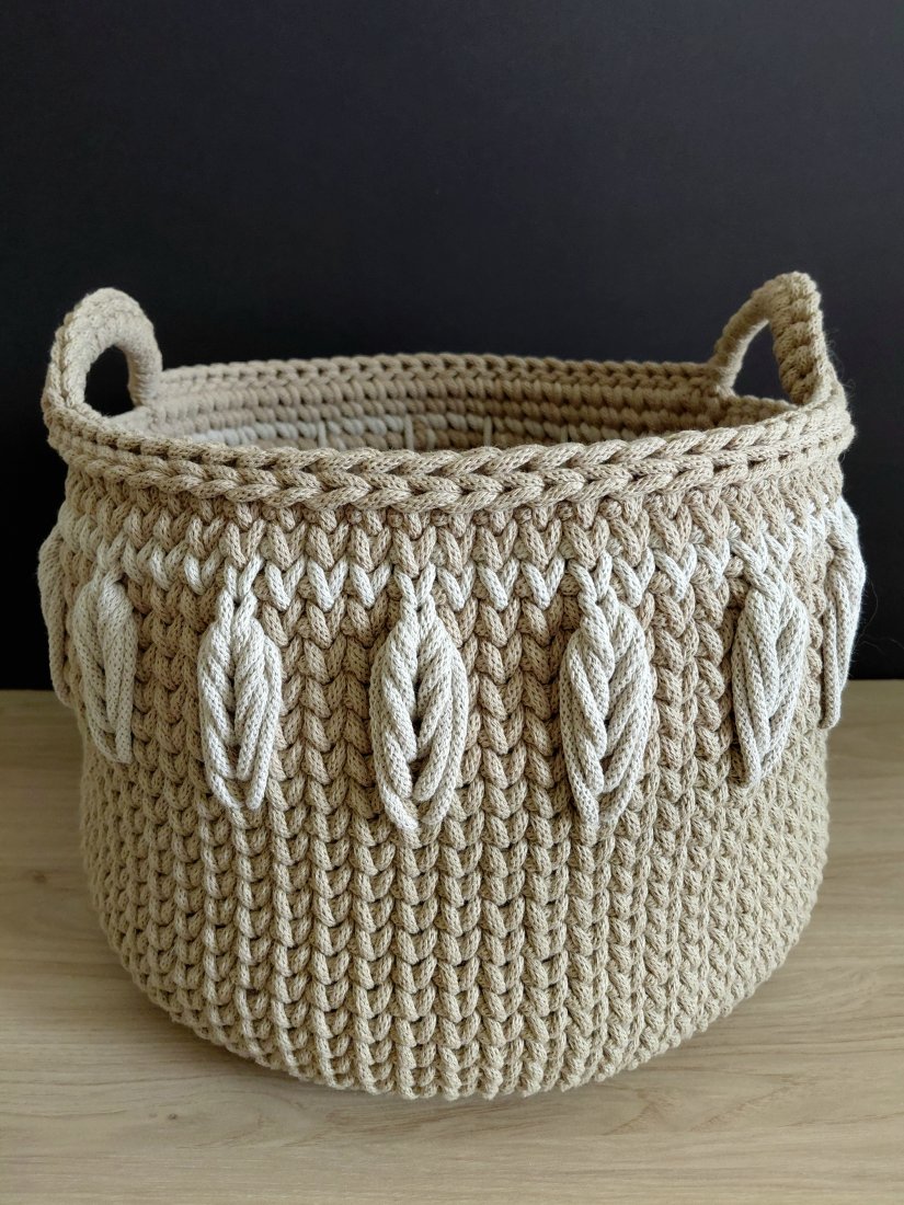 Duży kosz średnicy 34cm i wysokości 26cm plus uchwyty spleciony w całości ręcznie szydełkiem z certyfikowanego, 100% bawełnianego sznurka grubości 0,5cm w tonacjach beżowo-piaskowych i ozdobiony sznurkowymi kłosami.