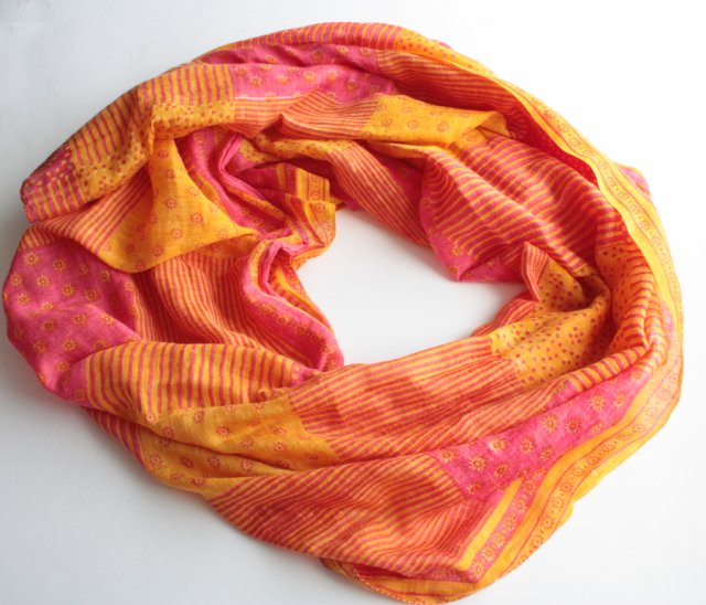 Miękki, duży szal wykonany z cienkiej, miękkiej tkaniny, którą oceniam na bawełnę. Odcienie to malinowy róż i jasny pomarańcz.
