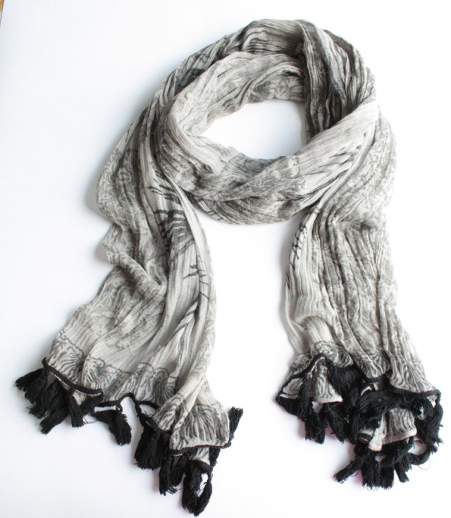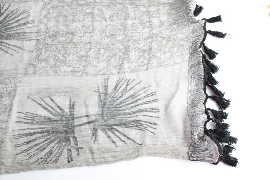 Miękki, miły w dotyku szal wykonany z tkaniny w odcieniach szarości o luźnych splotach. Brzegi wykończno miękkimi frędzlami.