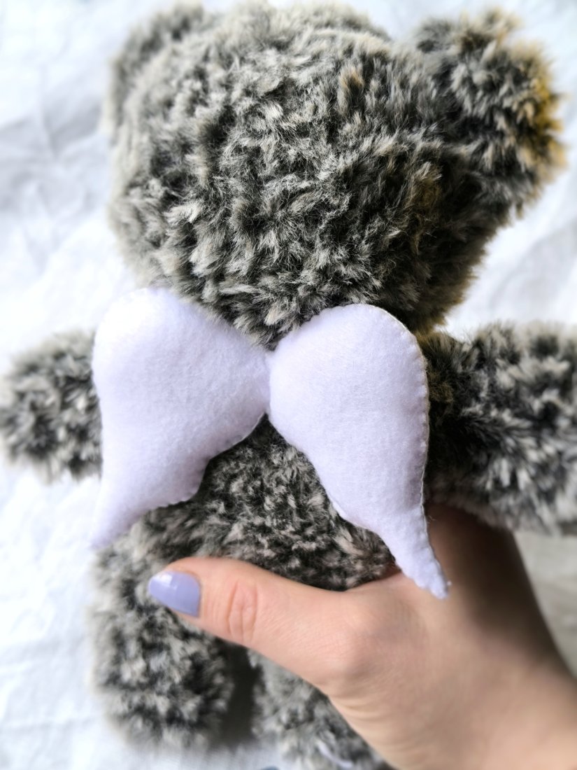 Puchaty przyjaciel, towarzysz zasypiania lub zabaw a może doskonały prezent na Pierwszą Komunię? Jest to niezwykły miś - aniołek. Jego skrzydełka są zdejmowane a szyję dekoruje biała tasiemka.