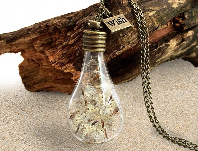 Ręcznie robiony naszyjnik z prawdziwymi nasionami dmuchawca umieszczonymi w szklanej żarówce .