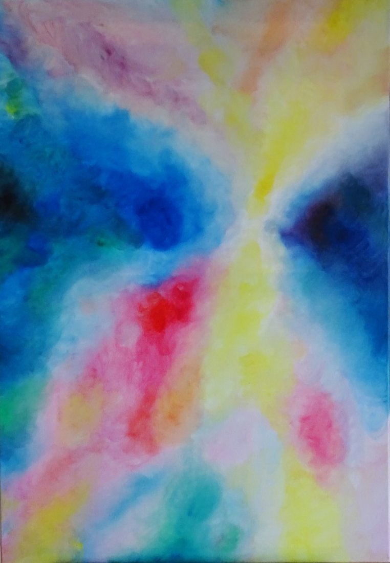 Ten obraz pulsuje jak oddech światła, jakby cała kompozycja była jednym wielkim rozbłyskiem energii rozlewającej się w różnych kierunkach. Miękkie, rozmyte przejścia barw sprawiają wrażenie, że obserwujemy narodziny czegoś ulotnego i niematerialnego — może emocji, może wspomnienia, może kosmicznego zjawiska, które dopiero nabiera kształtu.