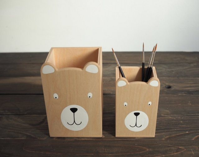 Pojemnik na kredki, wykonany z drewna, pomalowany farbami akrylowymi. Całość pokryta lakierem bezbarwnym.