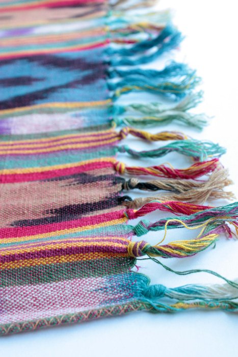 Duży, oryginalny, kolorowy szal z frędzlami.