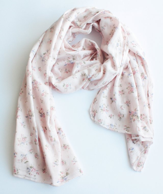 Miękki, duży szal w drobne różyczki na tle pudrowego różu. Materiał to prawdopodobnie bawełna lub wiskoza.