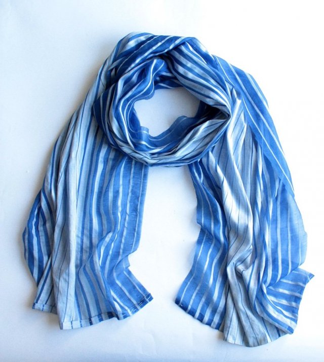 Duży szal w pasy w odcieniach błękitu. Materiał to prawdopodobnie mieszanka bawełny i jedwabiu.