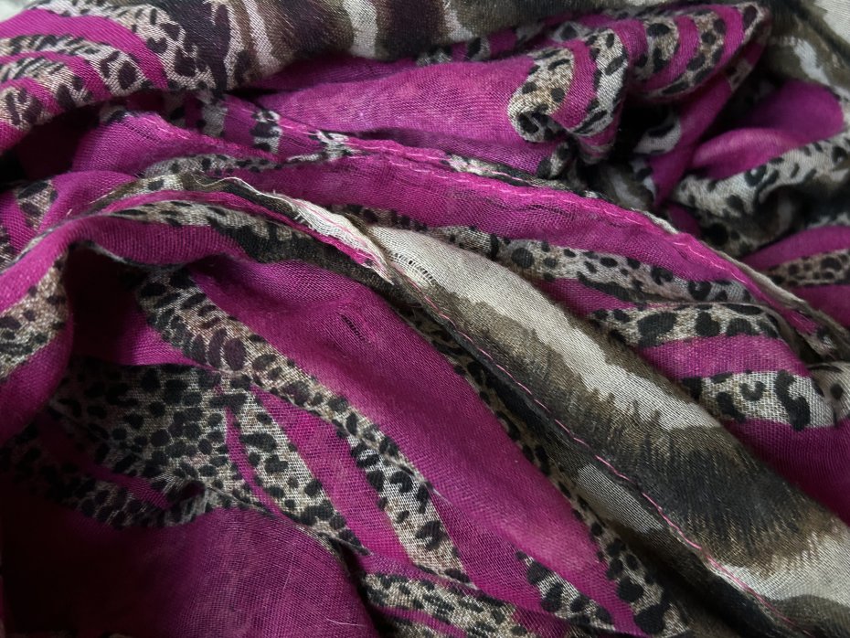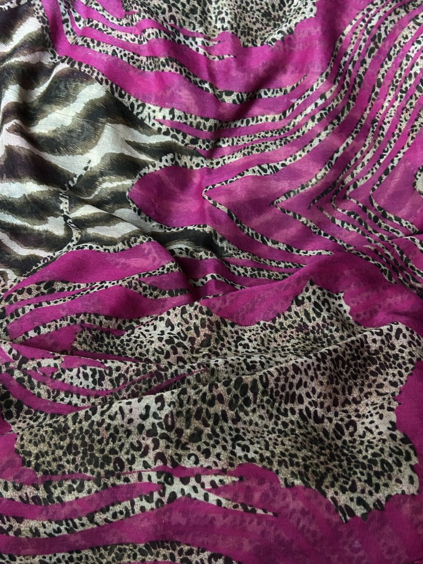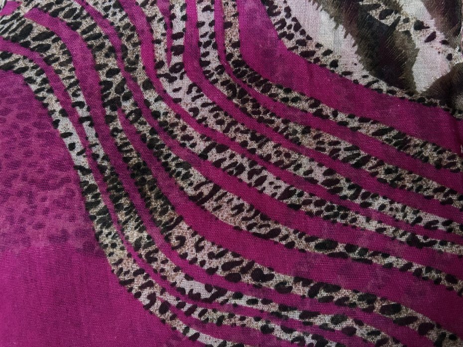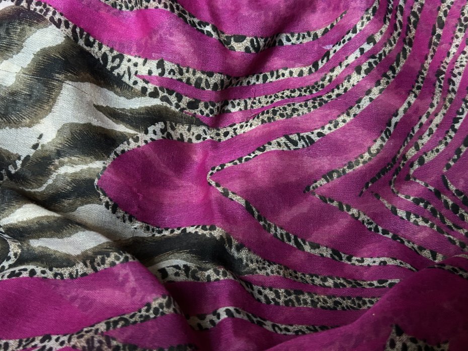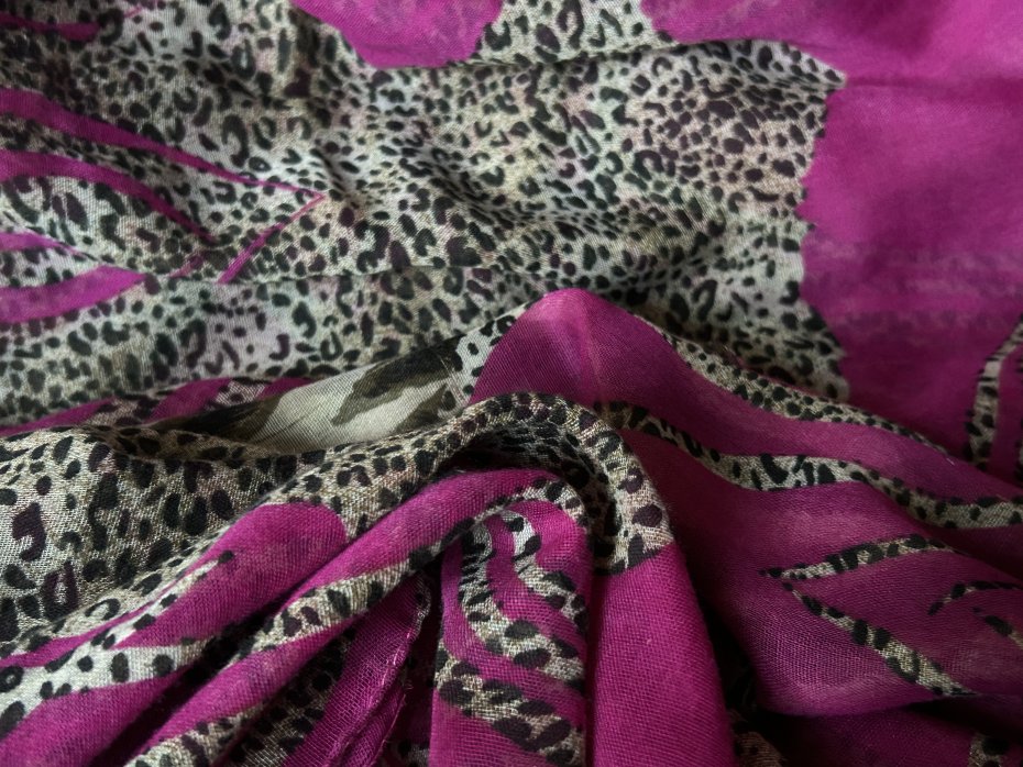 Oryginalny duży szal - pareo . Bez metek . . Dość cienki , lekki , przyjemny w dotyku .Drapiezny print zwierzęcy na amarantowym tle . Idealny nie tylko na na lato Na plażę i letnie dni i wieczory . Aż świeci w barw złożeniu i abstrakcyjnym wzorze zachwyca oryginalnością . 110 x 170 plus Stan zachowania - dobry , drobne ślady użytkowania .