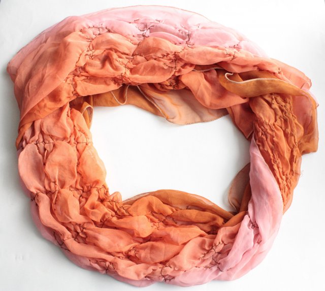 Szal o unikatowej fakturze, w przelewanych odcieniach stonowanego pudrowego różu i zgaszonego pomarańczu.