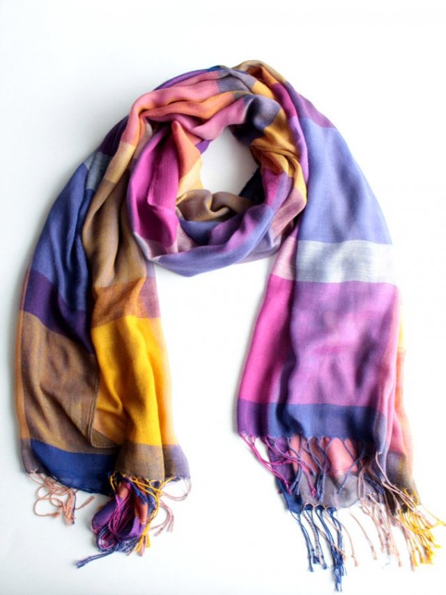 Lekki, duży, miękki szal w kratę w żywych barwach.