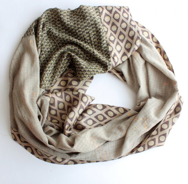 Duży szal o różnych deseniach, z łączonych materiałów. Materiał to prawdopodobnie wiskoza.