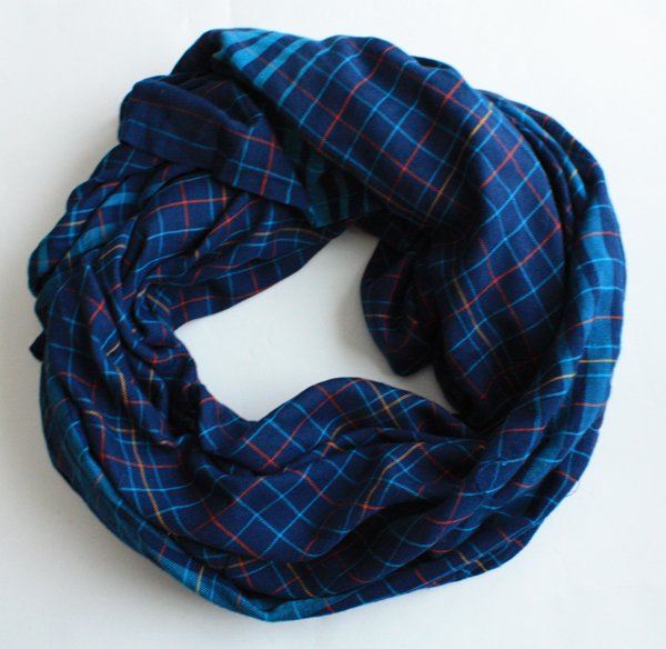 Wielki, grubszy szal w kratę na granatowym tle. Materiał to prawdopodobnie wiskoza.