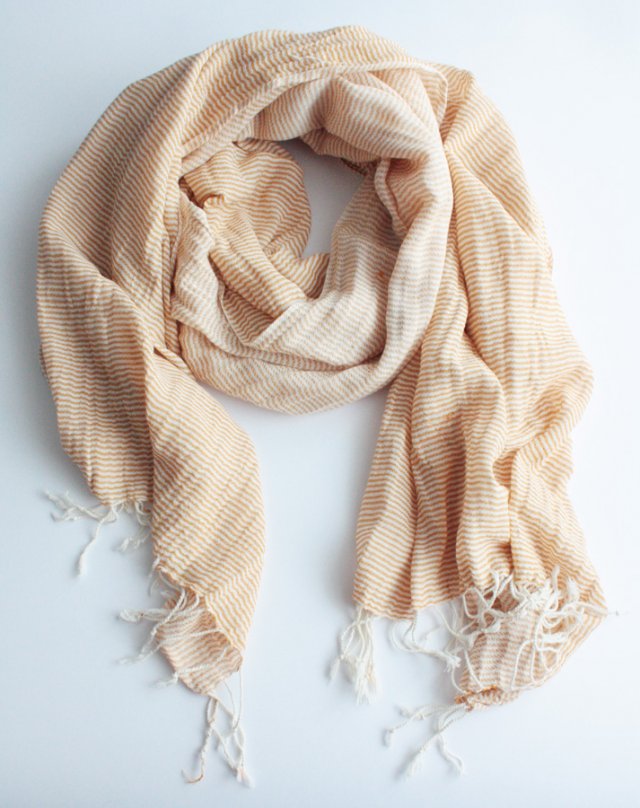 Duży, miękki szal w kremowo-beżowe prążki. Wykonany prawdopodobnie z bawełny lub wiskozy.