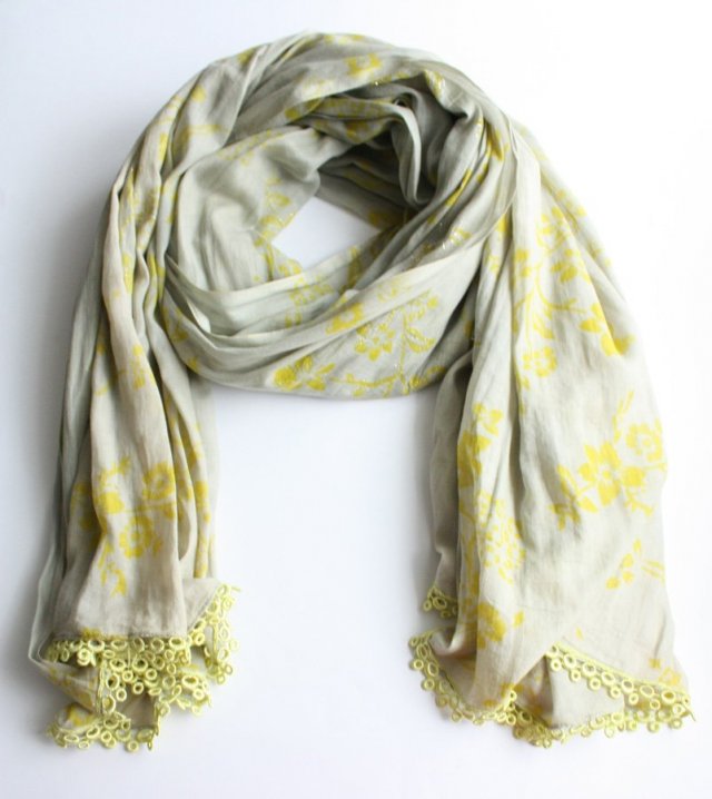 Miękki, duży szal ozdobiony miejscami subtelnym srebrnym haftem.